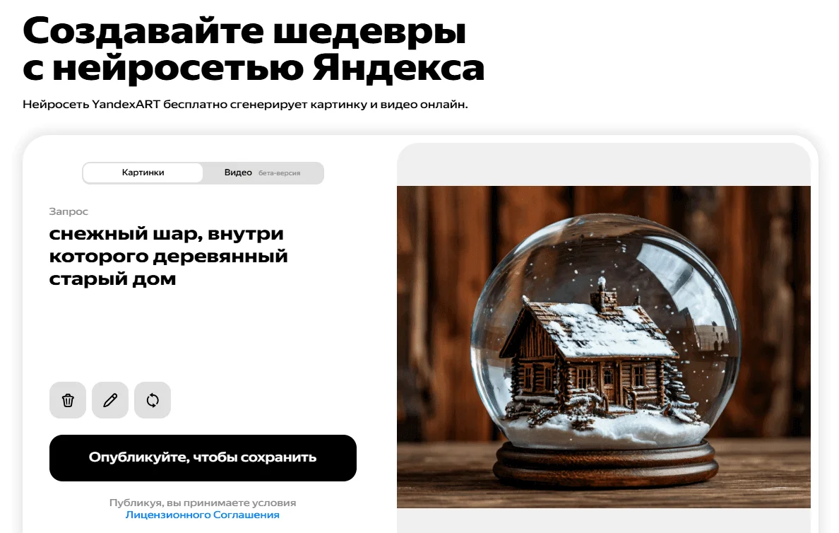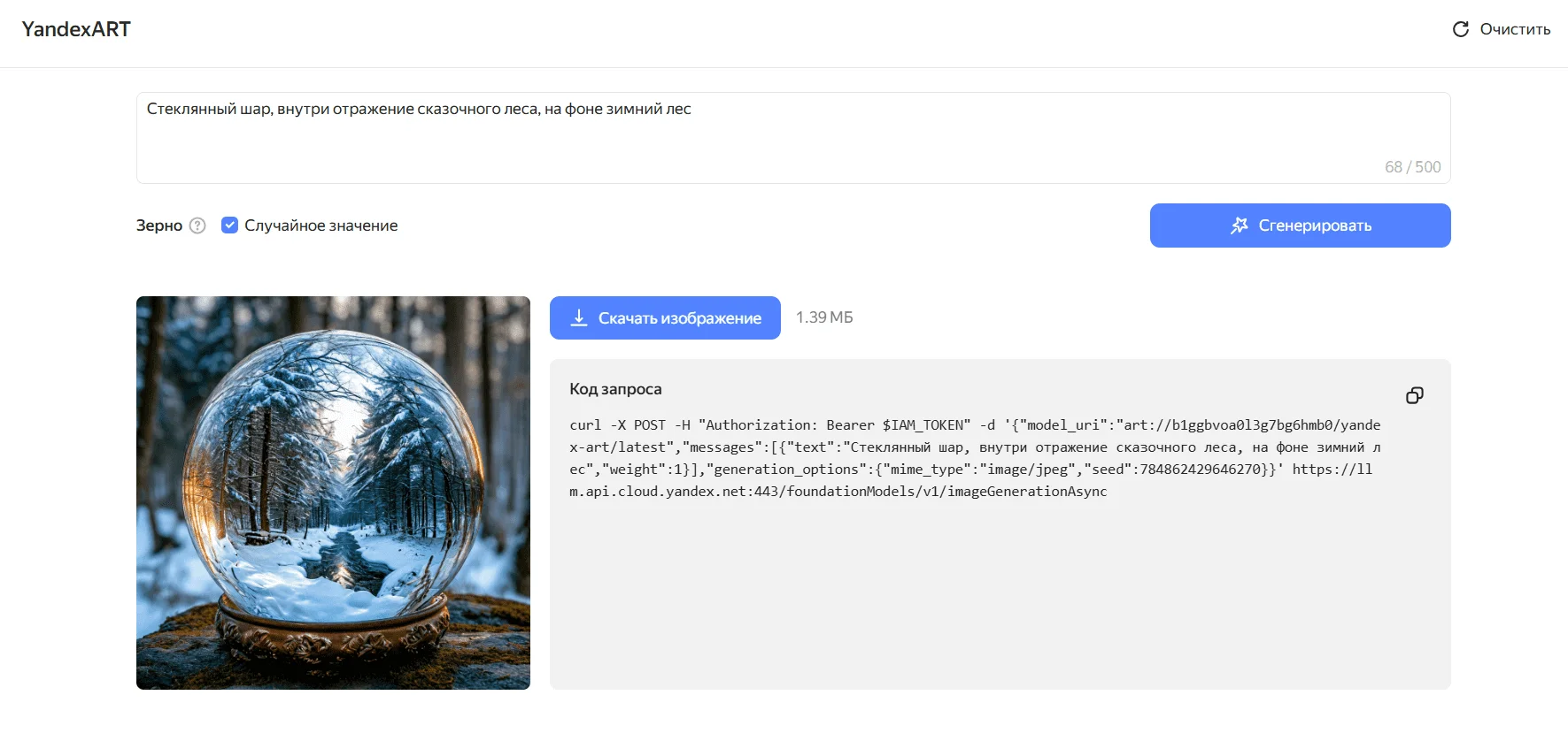 YandexArt. Это нейросеть для генерации изображений. Чтобы получить картинку, нужно ввести текстовый промпт. Изображение можно скачать, а справа сервис напишет код генерации.