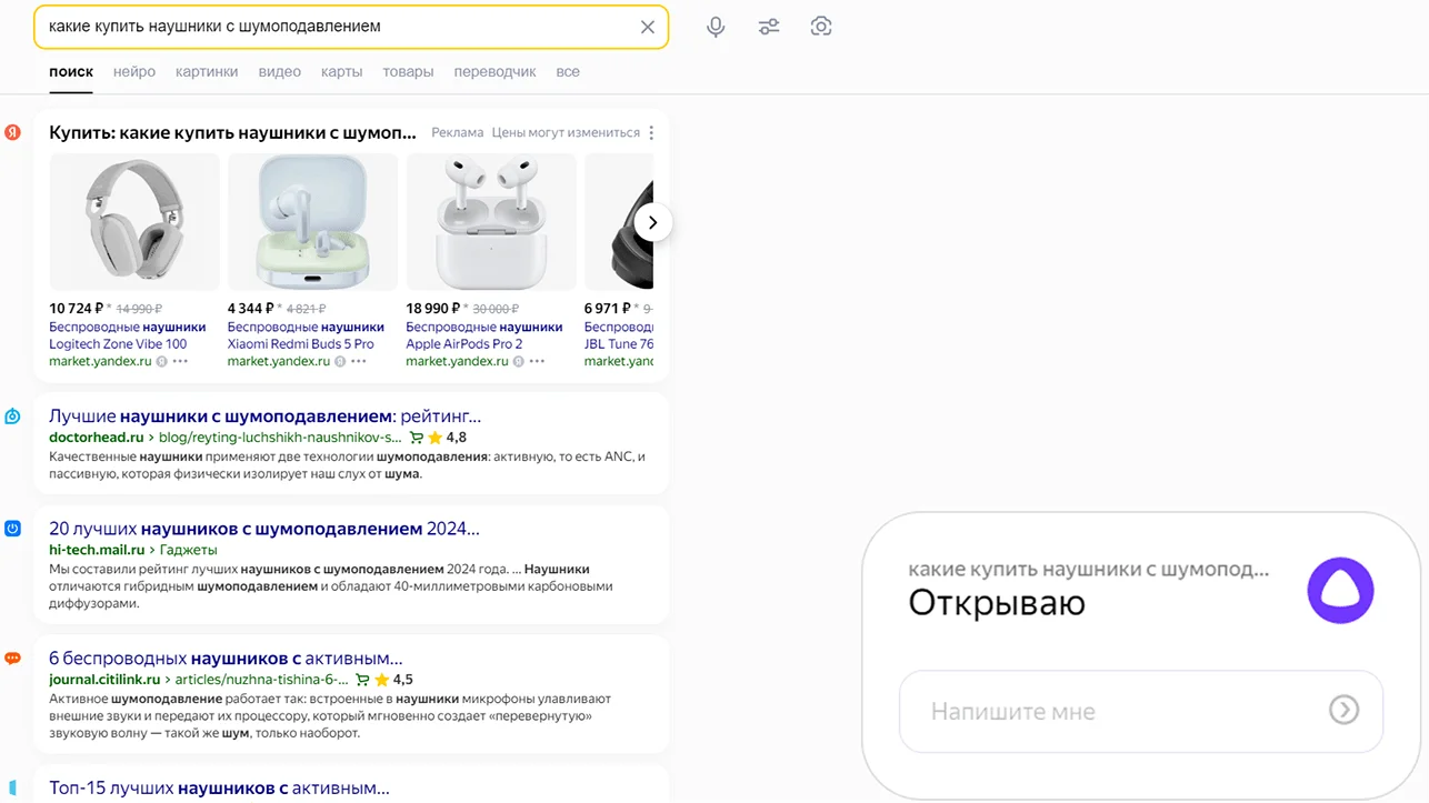 В этом окне Алиса дает только краткие ответы: показывает курс доллара, погоду или время в Лиссабоне. На остальные вопросы ассистент переводит на поисковые запросы. Например, если спросить ее «Где лучше купить наушники», Алиса переведет на страницу поиска.
