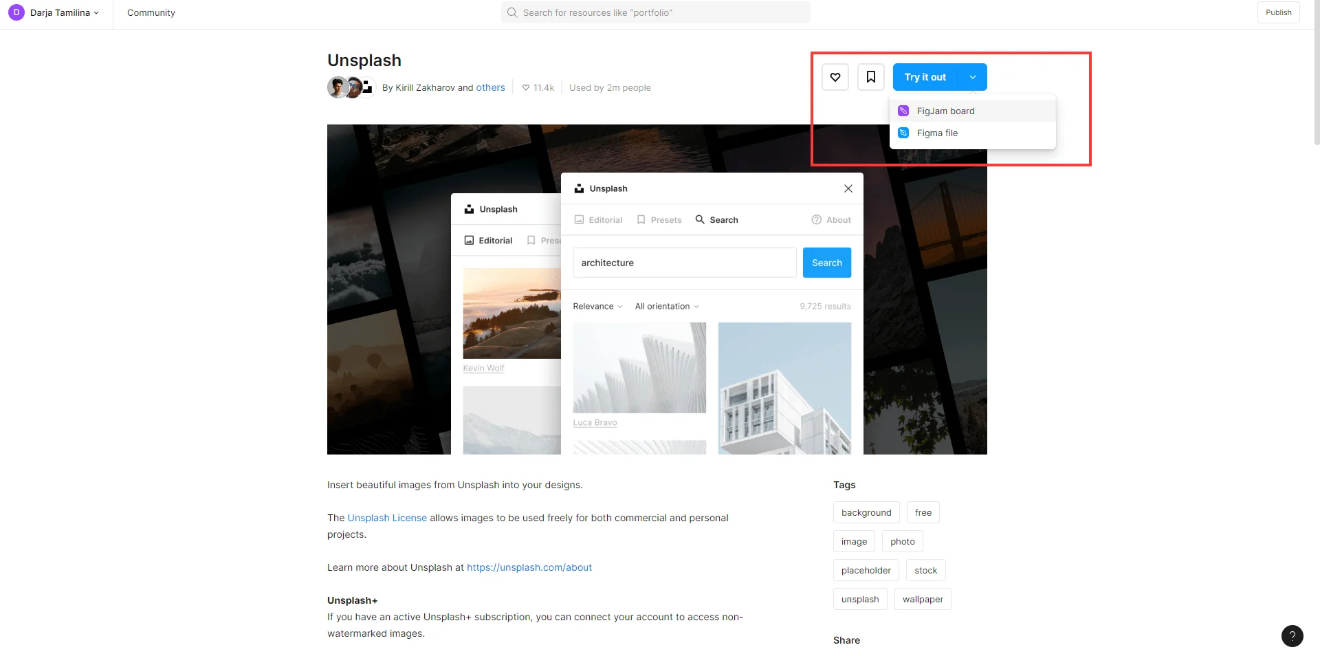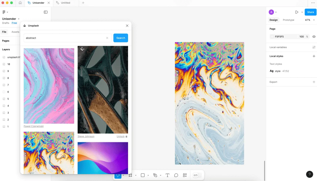 Unsplash — один из крупнейших бесплатных фотостоков, который работает в России. Плагин дает более удобный доступ к Unsplash. Например, если вы работаете с шаблоном поста или презентации, и хотите поменять какую-то фотографию, это можно будет сделать не выходя из Figma. Если составляете мудборд для дизайнера, можно также прямо в Figma подбирать фото и компоновать на доску. Плагин открывается в обычном файле Figma и в FigJam — выбрать можно на странице с описанием.