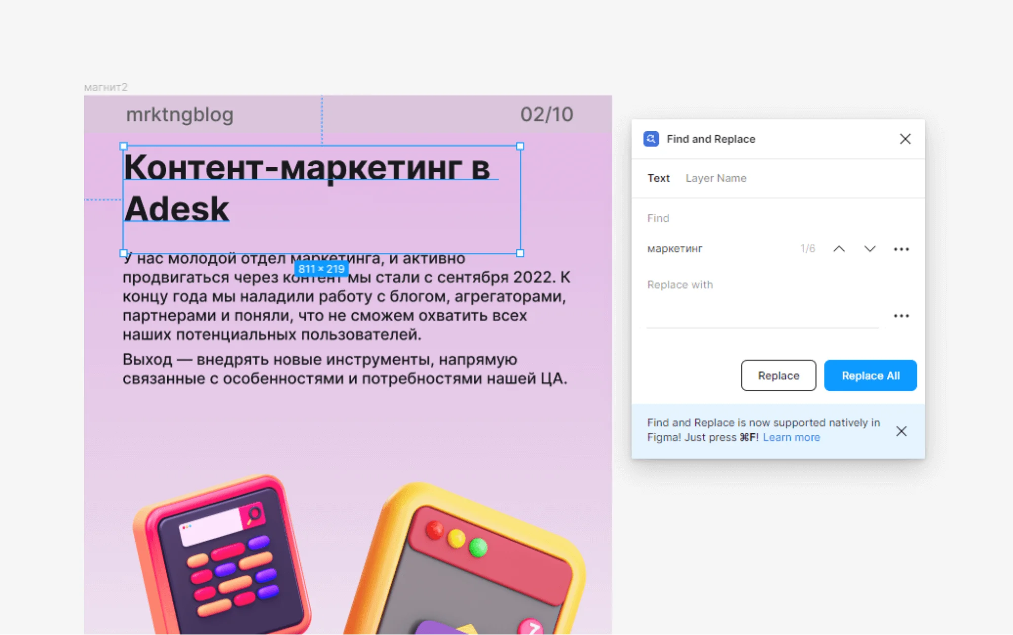 В Figma пока нет возможности автоматически проверять орфографию и пунктуацию на русском языке, зато можно найти нужное слово и заменить на другое — с помощью этого плагина. Это поможет, если вы хотите быстро внести правку во все макеты: поправить орфографию или употребление какого-то слова. При замене через плагин исправление распространится на все макеты в файле, при этом сохранится верстка и стиль текста, который задал дизайнер. Так можно удобно править тексты, не боясь «поломать» чего-то в дизайне.