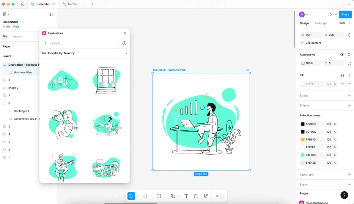 Надо признать, что выборка внутри плагина все равно сильно меньше, чем среди дизайнерских файлов Community в целом, но зато пользоваться плагином на регулярной основе удобно. Если вам понравится один из предложенных стилей иллюстраций, можно при создании каждого макета в два клика вставлять нужное. Самостоятельно можно легко изменить размер и цвет элементов.