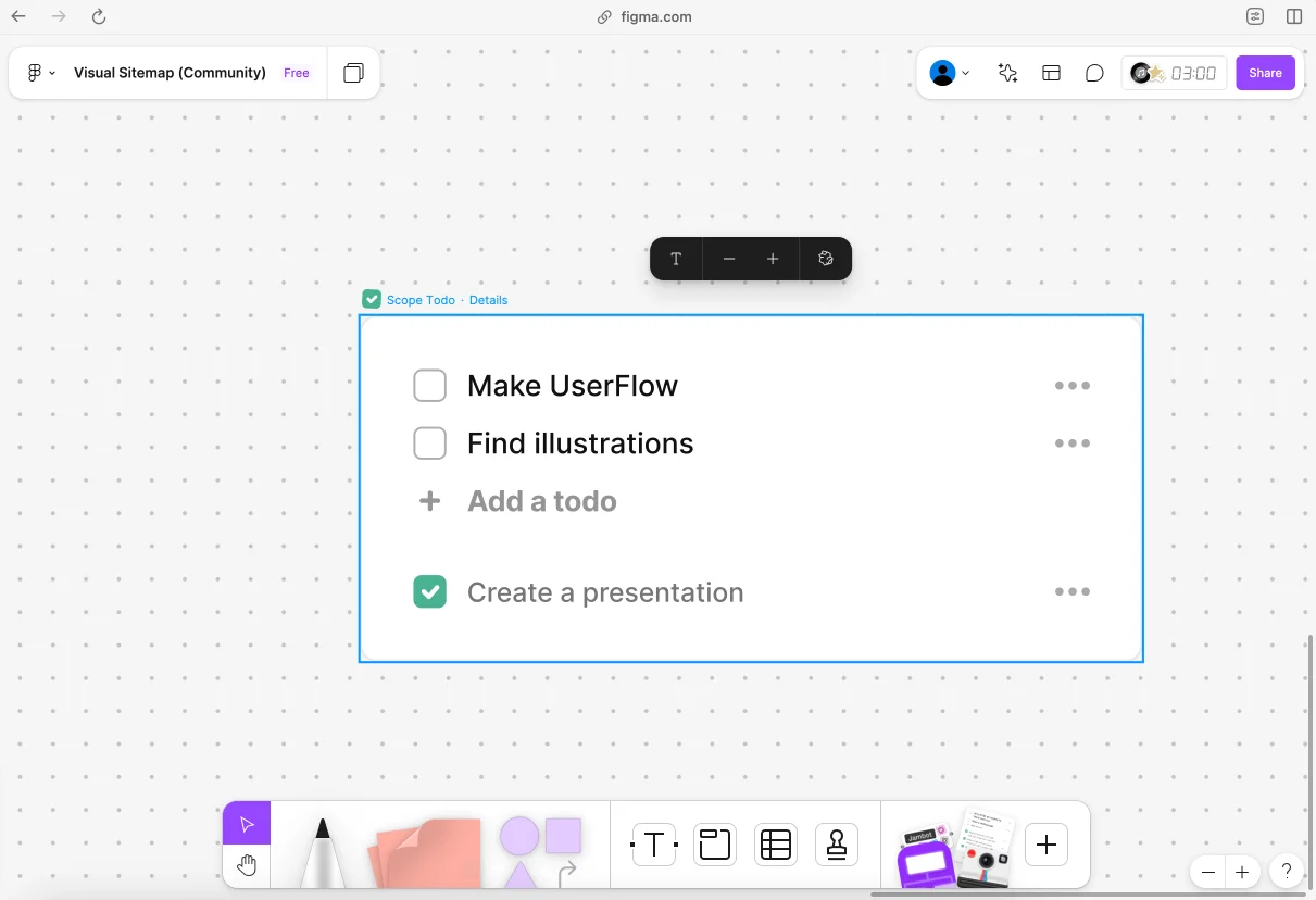 Это виджет для формирования списка, который можно использовать в обычных файлах или в FigJam. Например, при просмотре файлов от дизайнера сюда удобно вносить все правки, чтобы ничего не забыть. А возможно, вы захотите составить такой список для себя — чтобы знать, к каким моментам хотите вернуться повторно. На досках FigJam можно найти виджету и более широкое применение: например, в них удобно фиксировать адженду встречи и ставить галочки напротив пунктов, которые обсудили.