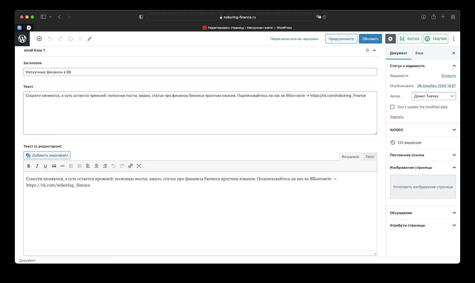Как это работает. В определенное место письма вшивается HTML-код, который отсылает почтовик к определенной странице. На этой странице как раз и будет содержаться информация для рекламных вставок. В «Нескучных финансах» это сделано в WordPress — есть специальные закрытые для индексации страницы, в которых хранятся офферы писем. При отправке автоматического письма почтовик подтягивает информацию с этой страницы — достаточно поменять страницу и изменится рекламная вставка в новых отправленных письмах (но не в тех, что уже в инбоксе подписчика).