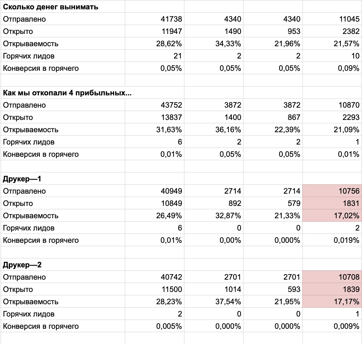 Я анализирую рассылку и делаю отчет о каждом письме в Google Таблицах. В основном меня интересует открываемость и конверсия в заявки. Письма, что хорошо открываются и приносят лиды, я сдвигаю к началу рассылки, а менее эффективные — в конец, либо вообще убираю из рассылки.