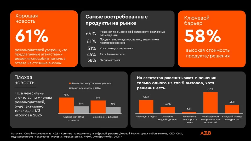 Согласно исследованию группы АДВ и комитета по маркетингу «Деловой России», рекламодатели ждут от агентств комплексных решений, которые влияют на рост бизнеса. Такой сдвиг связывают с инфляцией в медиа и повышенными требованиями к измеримости результатов.
