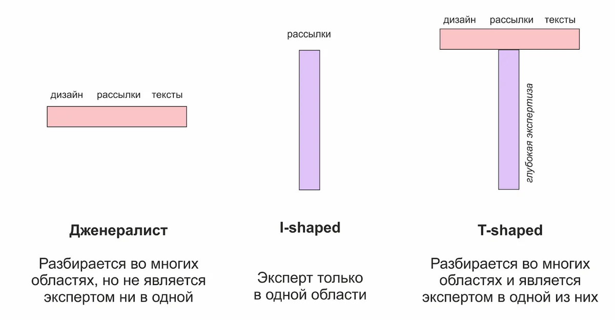 Нишеваться, конечно, необязательно. Многие компании готовы много платить людям, которые решат как можно больше их задач. Но если специалист делает «всего понемногу», он не сможет добиться глубокой экспертности ни в одной из областей. Редактор Словаря маркетолога Юля Чуракова затрагивала эту проблему в своей авторской колонке «Кто такие дженералисты и T-shaped специалисты».