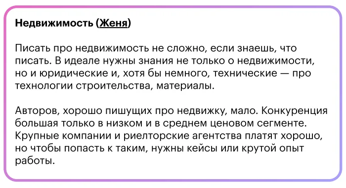Например, писать рекламные статьи для ПромоСтраниц. Такой эксперт может написать удачную статью, с которой польются лиды, про что угодно: автосервис, матрасы или БАДы. Также можно остановиться на одной сфере. Например, писать лендинги, посты, лонгриды и презентации, но только на одну тему — инвестиции, IT или туризм.