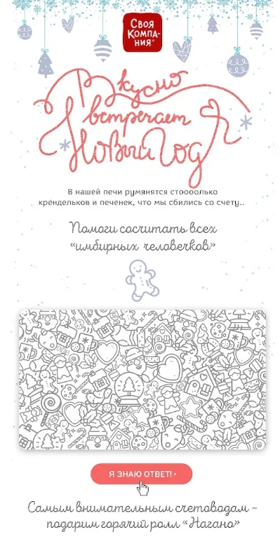 Праздничный тест. Придумайте интересную новогоднюю викторину. Хорошо, если это будут не просто вопросы про Новый год, а задания, связанные с вашим бизнесом. Например, мы в Unisender делали тесты, где предлагали угадать компанию по новогоднему креативу и проверить свои знания о новогоднем маркетинге. За правильные ответы можно предложить скидку или подарок.