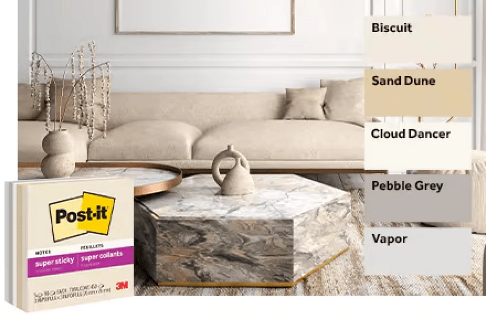 Post-it. Компания выпустила линейку бумажных стикеров для заметок в светлых и бежевых оттенках, среди которых есть и Cloud Dancer. Нейтральные цвета создают ощущение простоты, прямолинейности коммуникации.