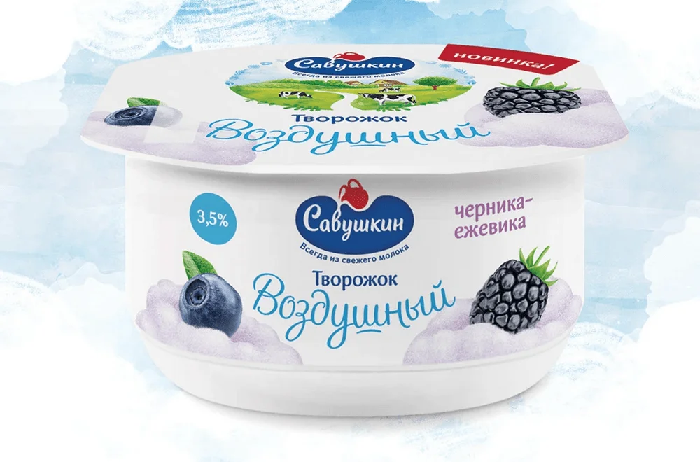 «Воздушная» упаковка для творожка «Савушкин». Дизайн подчеркивает нежность продукта.