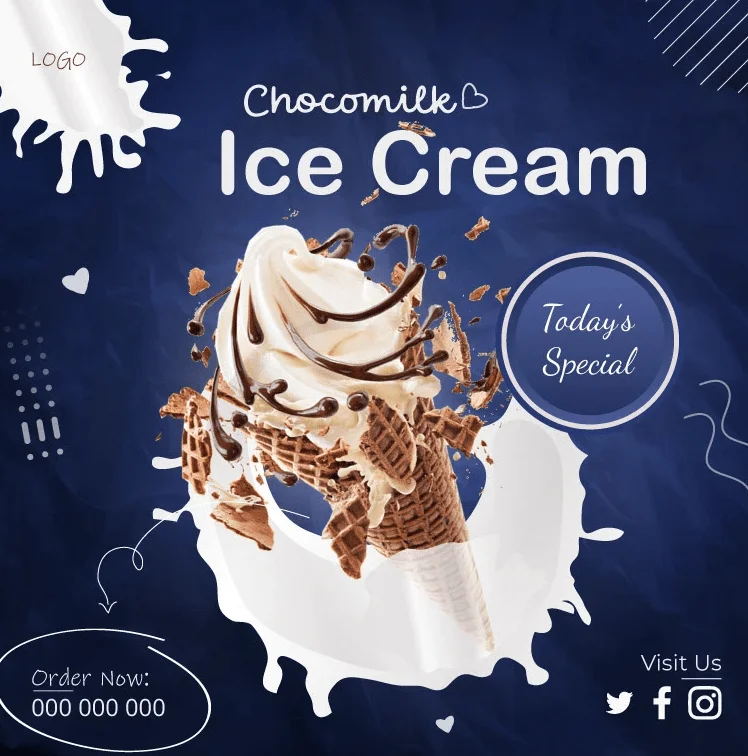 Оттенки белого можно использовать вместе с темным фоном. На картинке ниже — рекламный баннер для продвижения мороженого. Брызги белого цвета отражают то, что продукт молочный и натуральный.