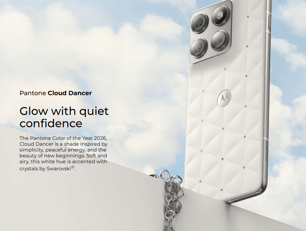 Motorola. Компания в коллаборации с Pantone представила смартфон motorola edge 70 в цвете Cloud Dancer, инкрустированный кристаллами Swarovski. Дизайн вдохновлен минимализмом, спокойной энергией и готовностью к новым свершениям, которые символизирует цвет года.