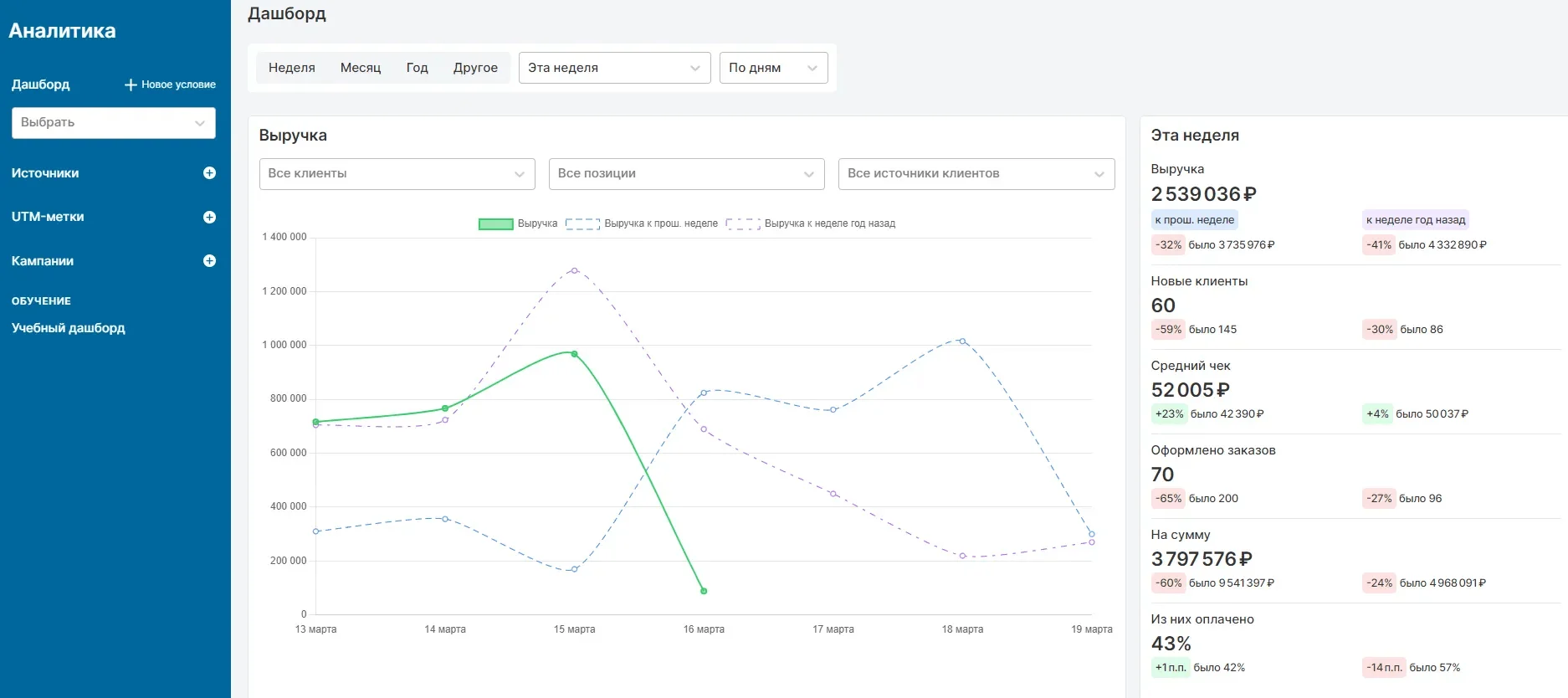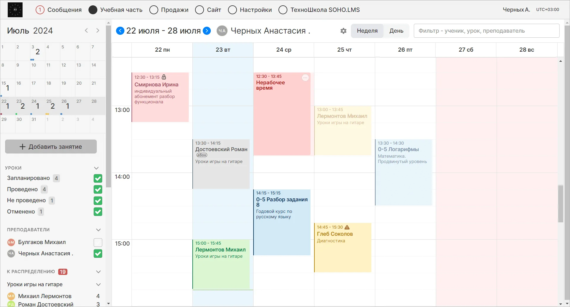 Учебная и коммерческая аналитика. Можно отслеживать нагрузку преподавателей, успеваемость учеников, переходы по UTM-меткам.