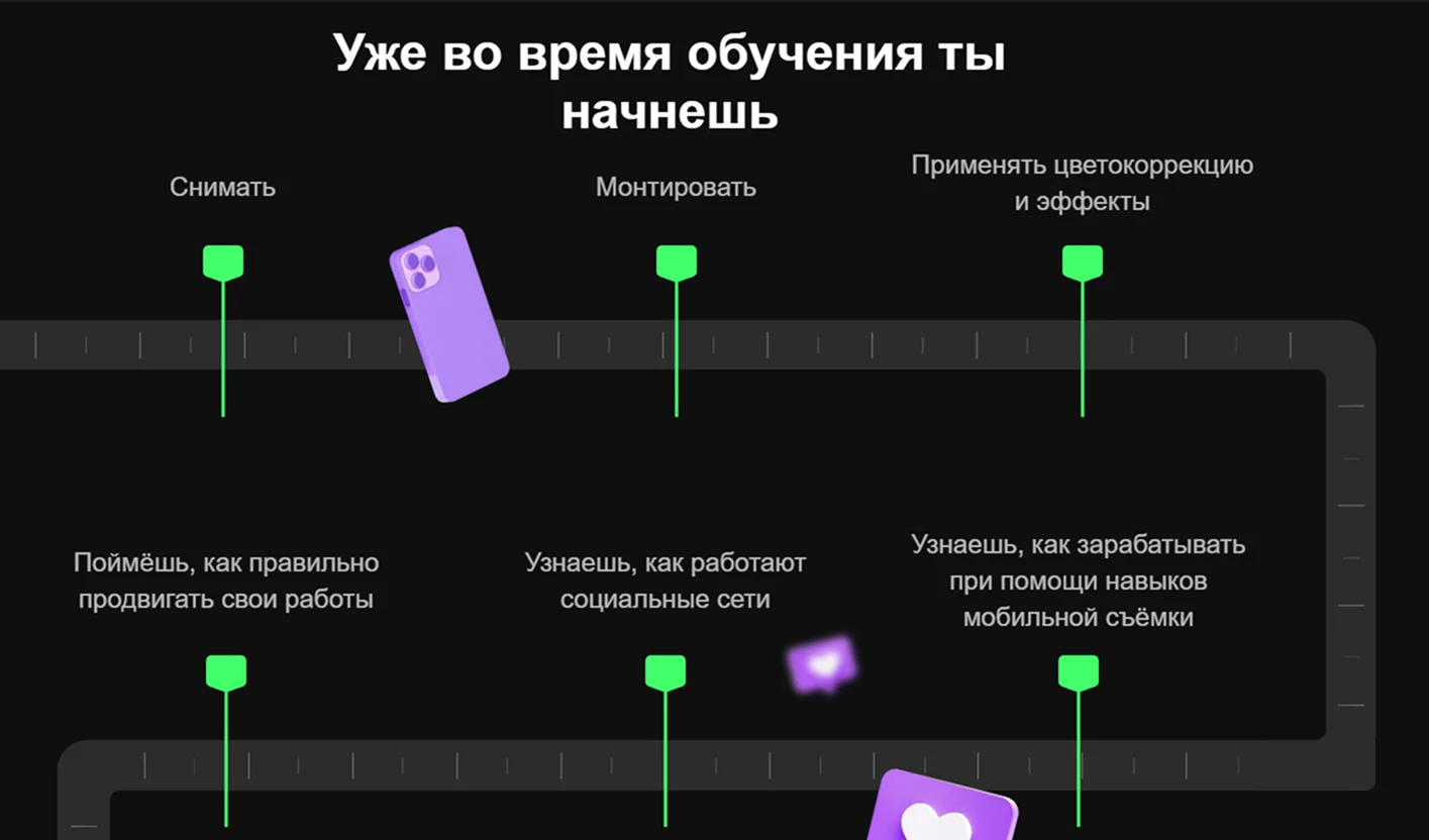 За 9 недель обучения вы разберетесь, как снимать, монтировать и продвигать видео для современных платформ — TikTok, YouTube Shorts и Instagram* Reels. Курс охватывает полный цикл работы с контентом: от идеи и съемки до публикации и получения охватов.