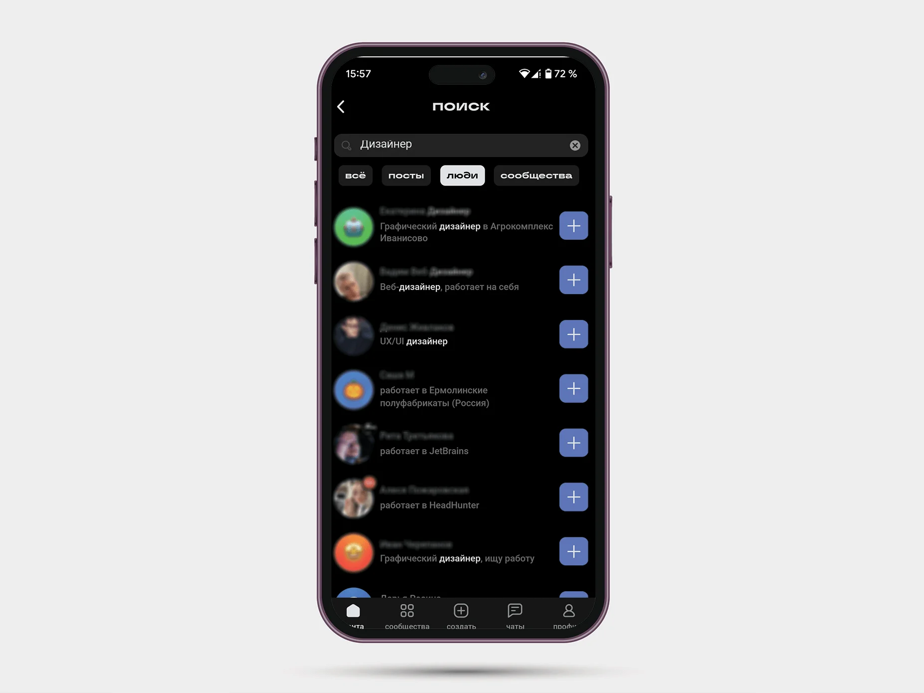 Каких-то особых возможностей для поиска работы в приложении нет — соцсеть придумывалась не для этого. Так что страницы с поиском вакансий или резюме остались на hh.ru, а в Сетке только нетворкинг. Но любого специалиста можно найти через поиск — вбиваете профессию и смотрите кандидатов. Правда, не все из них ищут работу, но так использовать Сетку никто не запрещает.