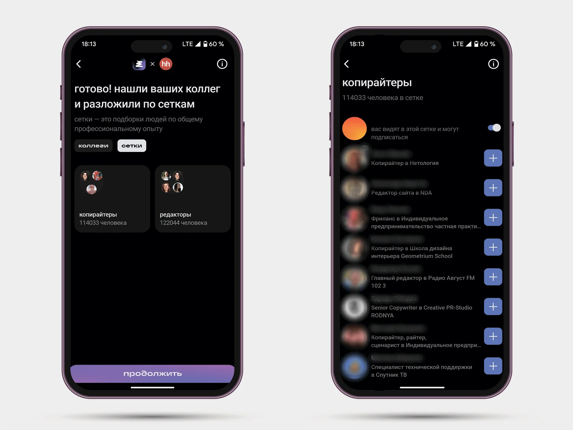После регистрации вас сразу распределят в «сетки» — это подборки людей по общему профессиональному опыту. То есть копирайтеры — к копирайтерам, аналитики — к аналитикам, дизайнеры — к дизайнерам. Еще пользователей объединяют по месту работы. В чате поддержки можно попросить добавить свою компанию, и всех, у кого она указана в опыте работы, добавят в эту сетку.