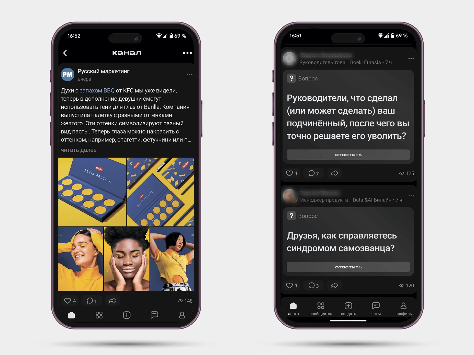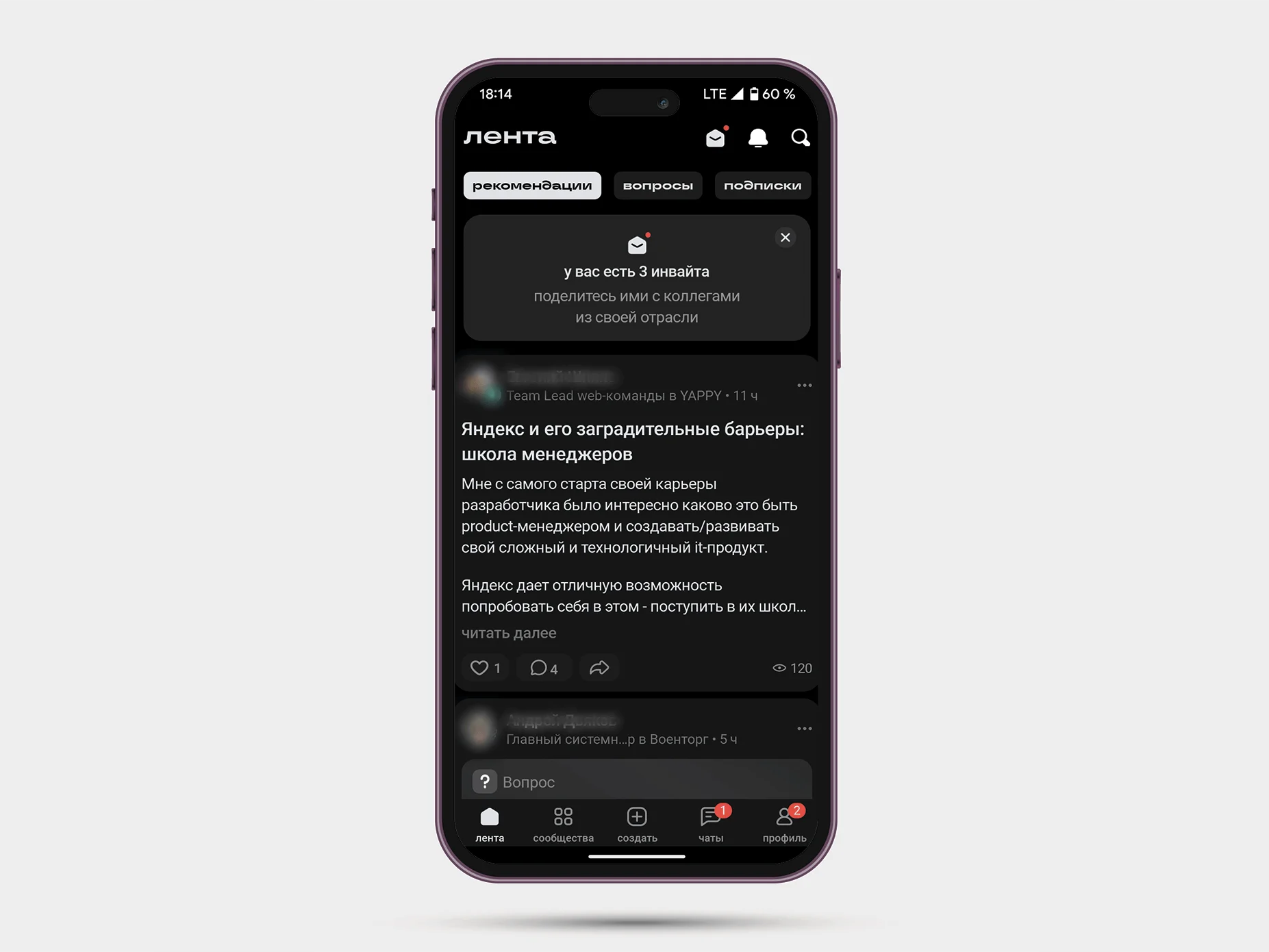 Лента. Есть три раздела. Рекомендации — сюда попадает все, что пересекается с вашим профессиональным опытом. Там вперемешку идут и посты сообществ, и пользователей. Второй раздел — это вопросы. Третий — подписки, то есть все публикации пользователей и сообществ, на которые вы подписались.