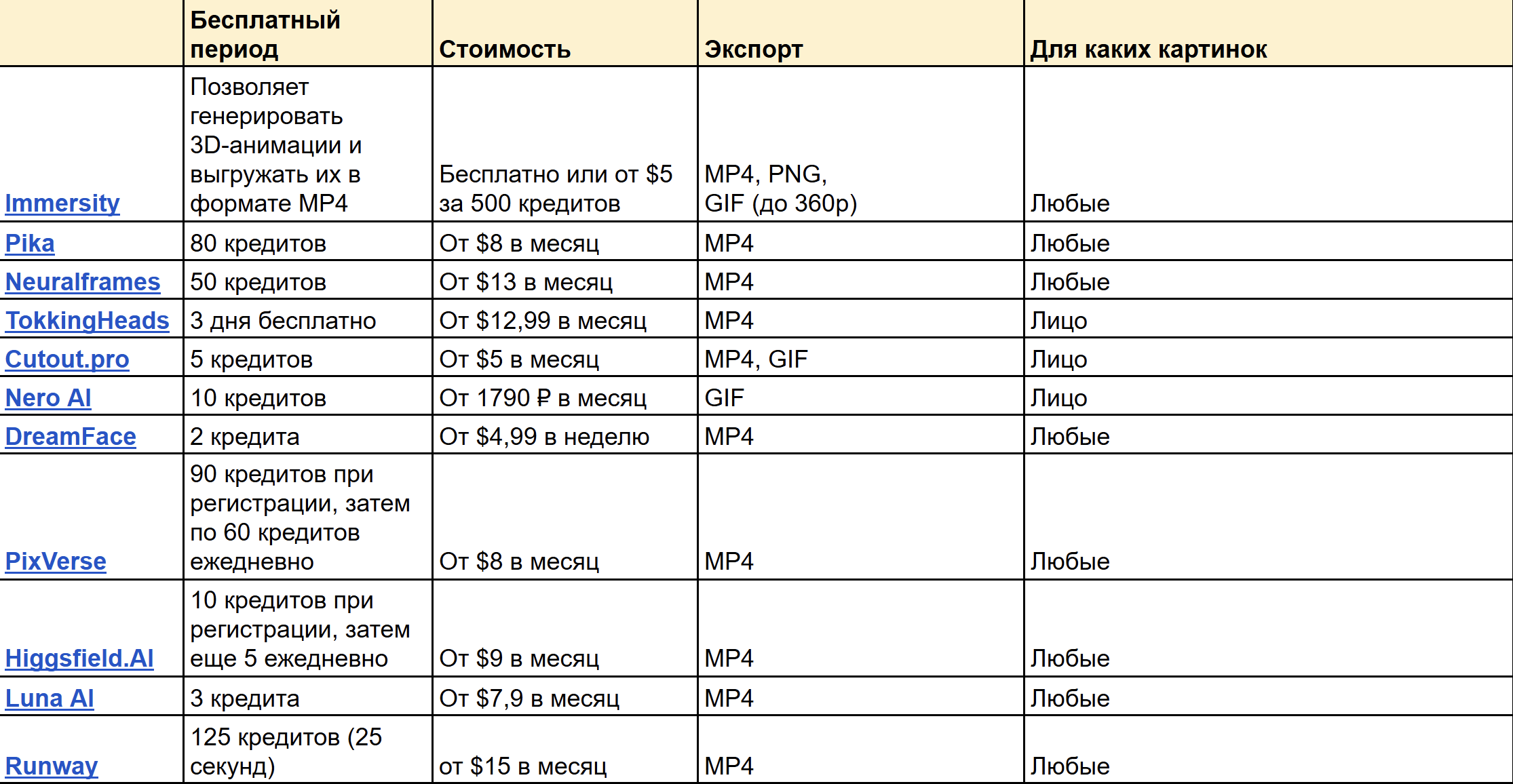 Чтобы анимировать картинки, можно пользоваться нейросетями. Они автоматически найдут нужные объекты и предложат эффекты для анимации. А чтобы определиться с сервисом было проще, смотрите нашу сравнительную таблицу. Собрали в нее все сервисы из статьи.