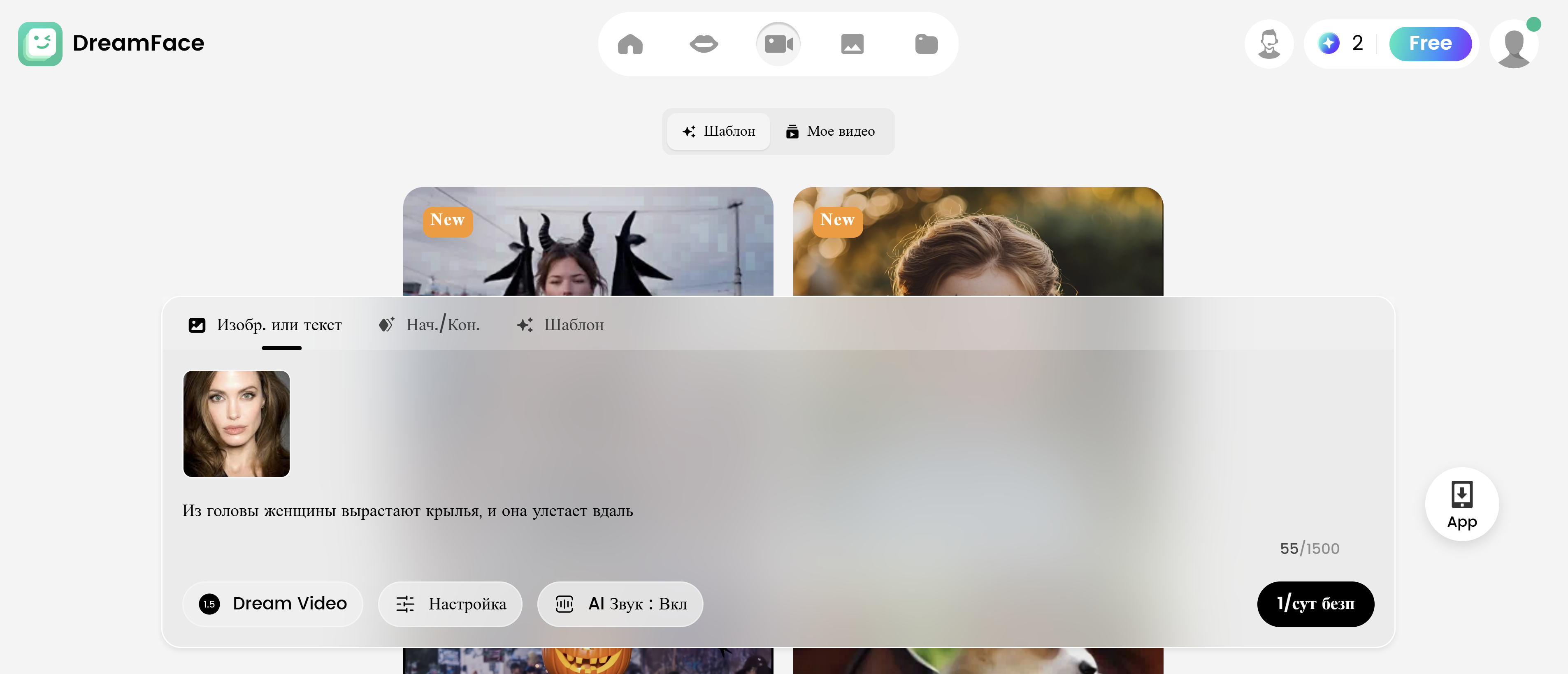Сервис с русскоязычной локализацией. Пока перевод не лучший, но все понятно, главное — DreamFace понимает промты на русском языке.