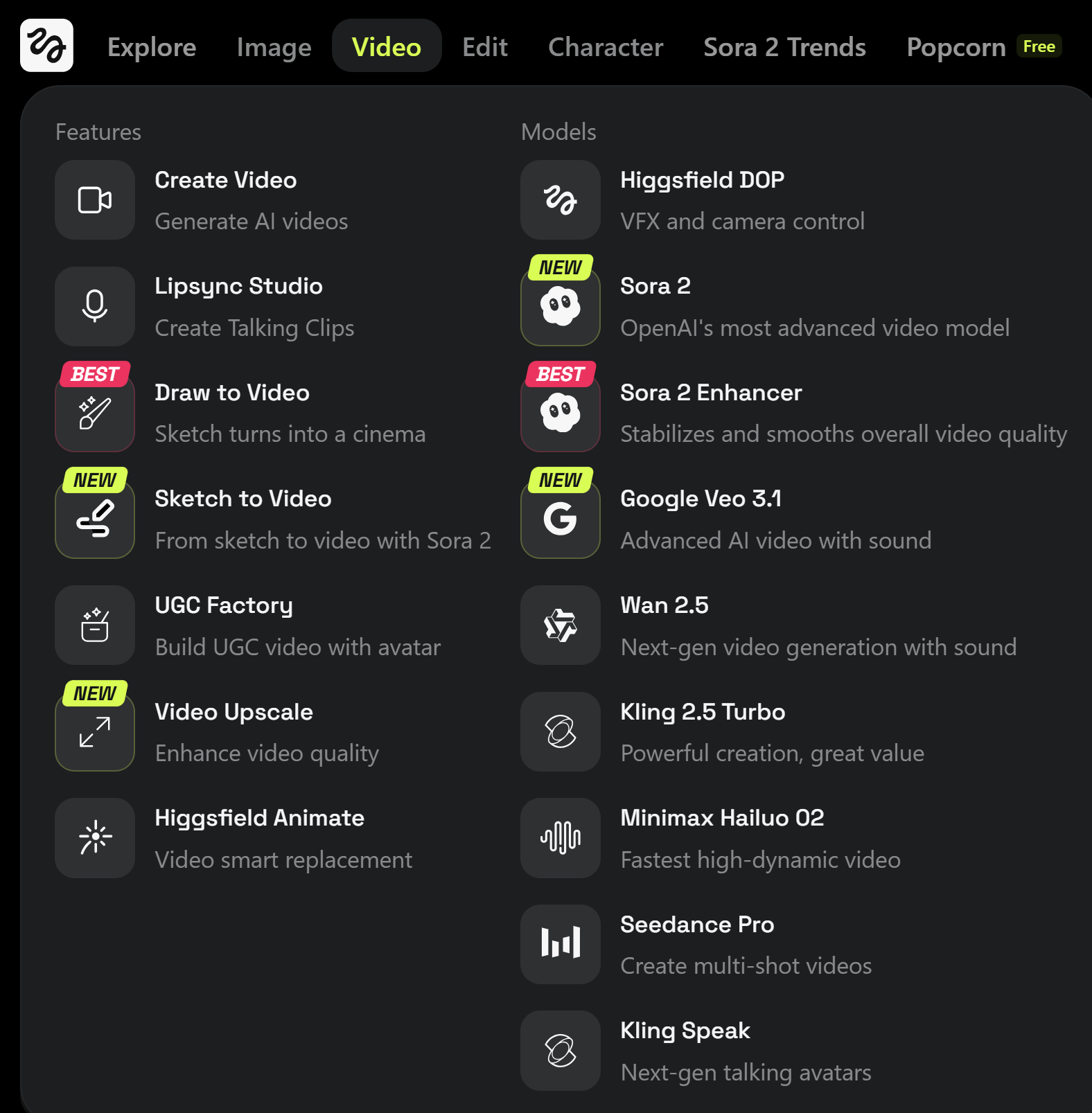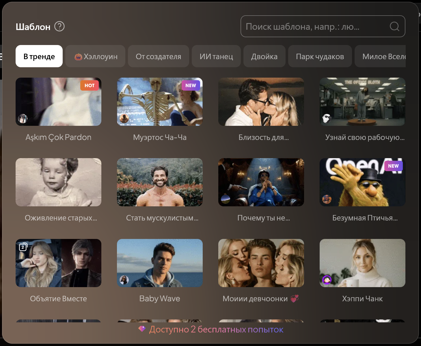 Универсальный сервис с множеством функций. Тут можно обрабатывать фотографии, создать видео из наброска, сгенерировать UCG-контент, а также превратить изображение в качественное видео. В Higgsfield.AI много красивых шаблонов для анимации картинок, и все они выглядят, как кадры из фильмов. Сервис предлагает сначала выбрать шаблон движения — как изображение будет двигаться. Затем загрузить фото и прописать промт. Некоторые шаблоны позволяют загрузить два фото: начало и конец видео. В каждой модели ИИ свой набор шаблонов.