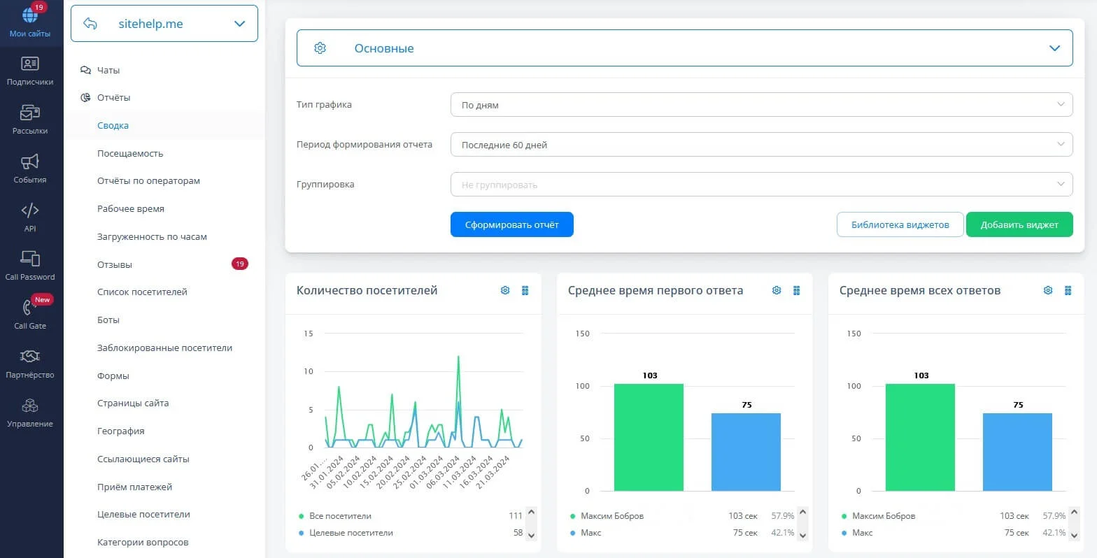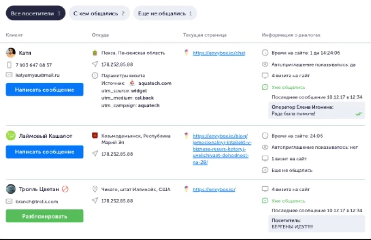 Функции. История общения с клиентами и каждый полученный лид сохраняются во встроенной CRM-системе. Также доступна аналитика по обращениям: можно отследить источник перехода на сайт. А статистика по операторам и сбор обратной связи от клиентов помогают оценить качество обслуживания.