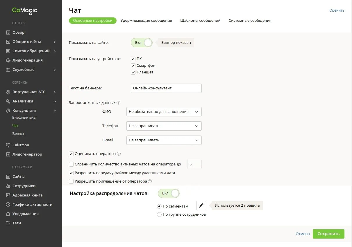 CoMagic — это маркетинговая платформа для лидогенерации, которая специализируется на коллтрекинге и аналитике. Одна из функций сервиса — ОМНИчат, которая помогает собирать сообщения со всех источников общения с аудиторией: соцсетей, мессенджеров, сайта.