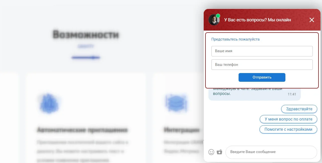 Также можно подключить чат-бота, который ответит на стандартные вопросы пользователя, поможет принять решение, сохранит контакты и передаст их оператору. За дополнительную плату можно подключить умного AI-ассистента, который сможет поддерживать беседу вместо операторов поддержки.
