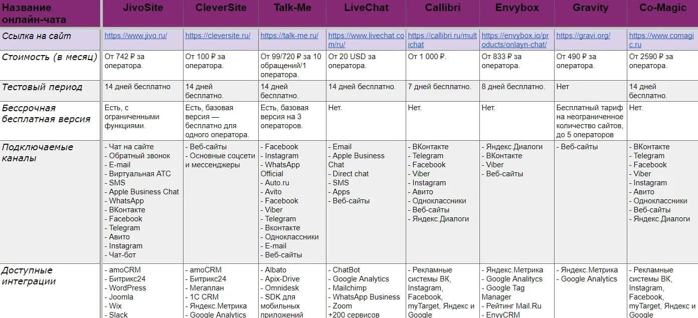 Практически все онлайн-консультанты имеют схожий базовый функционал, направленный на вовлечение пользователей в диалог, активные коммуникации и удержание посетителей на сайте. Но некоторые отличительные особенности могут стать решающими при выборе сервиса. Чтобы упростить выбор, я сравнила онлайн-чаты по основным характеристикам и составила таблицу: