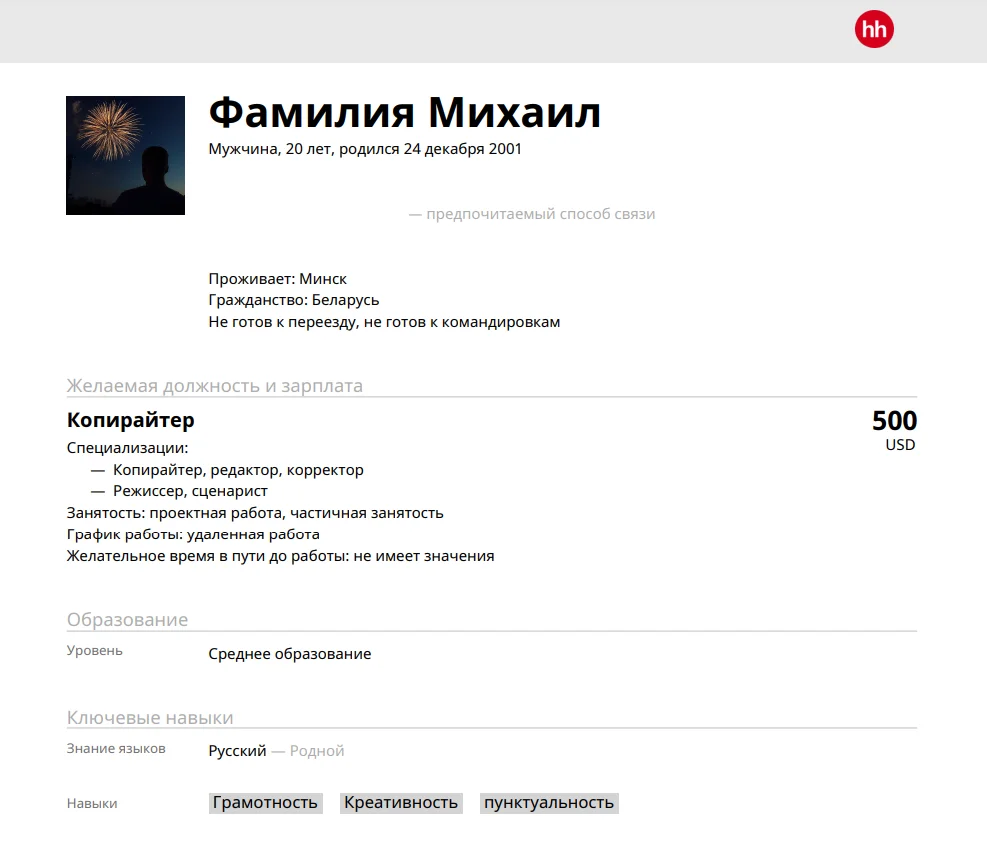 Преимущества. Можно импортировать информацию с HH.ru. Все пользователи получают персональный сайт-резюме, который могут отправлять работодателю. Сайт адаптивный, поэтому будет корректно отображаться на любых устройствах.