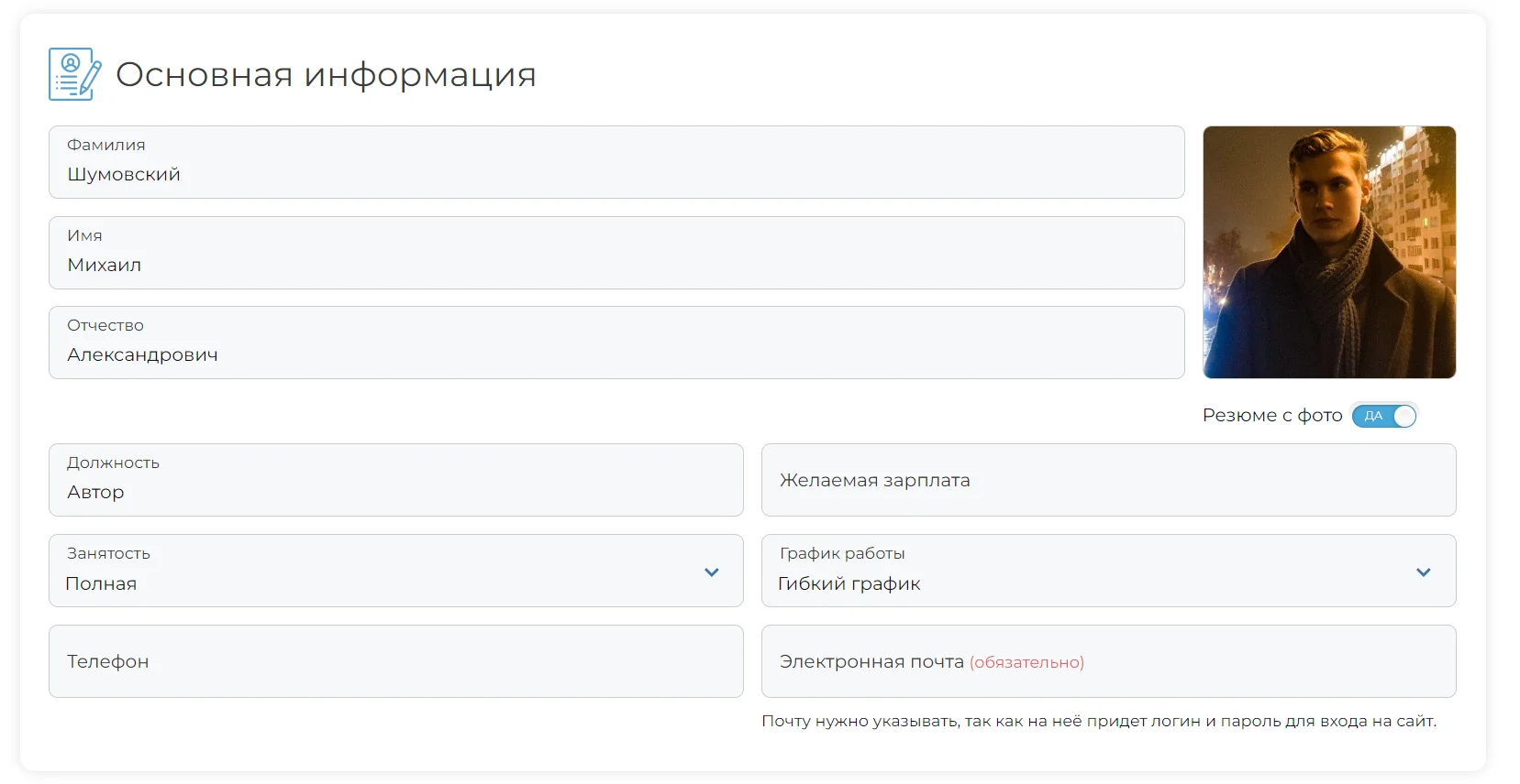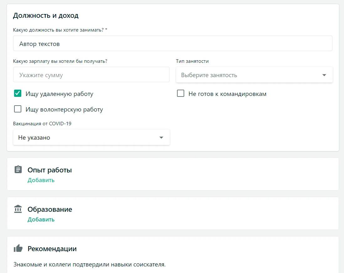 Для создания резюме есть всего один шаблон. В нём нужно пошагово вводить информацию: все поля уже обозначены, достаточно наполнить их своим контентом.