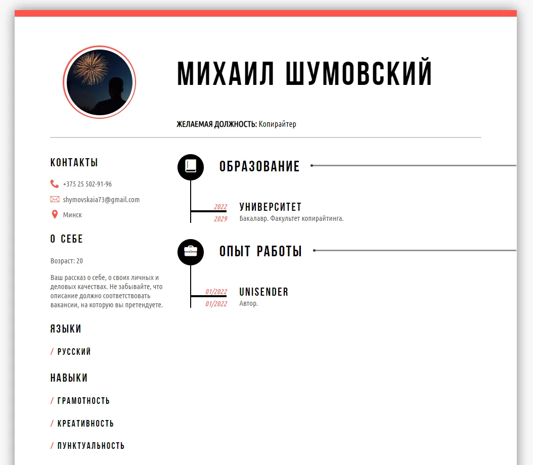 Если вы хотите создать резюме на отдельном сайте, воспользуйтесь бесплатным конструктором лендингов от Unisender: