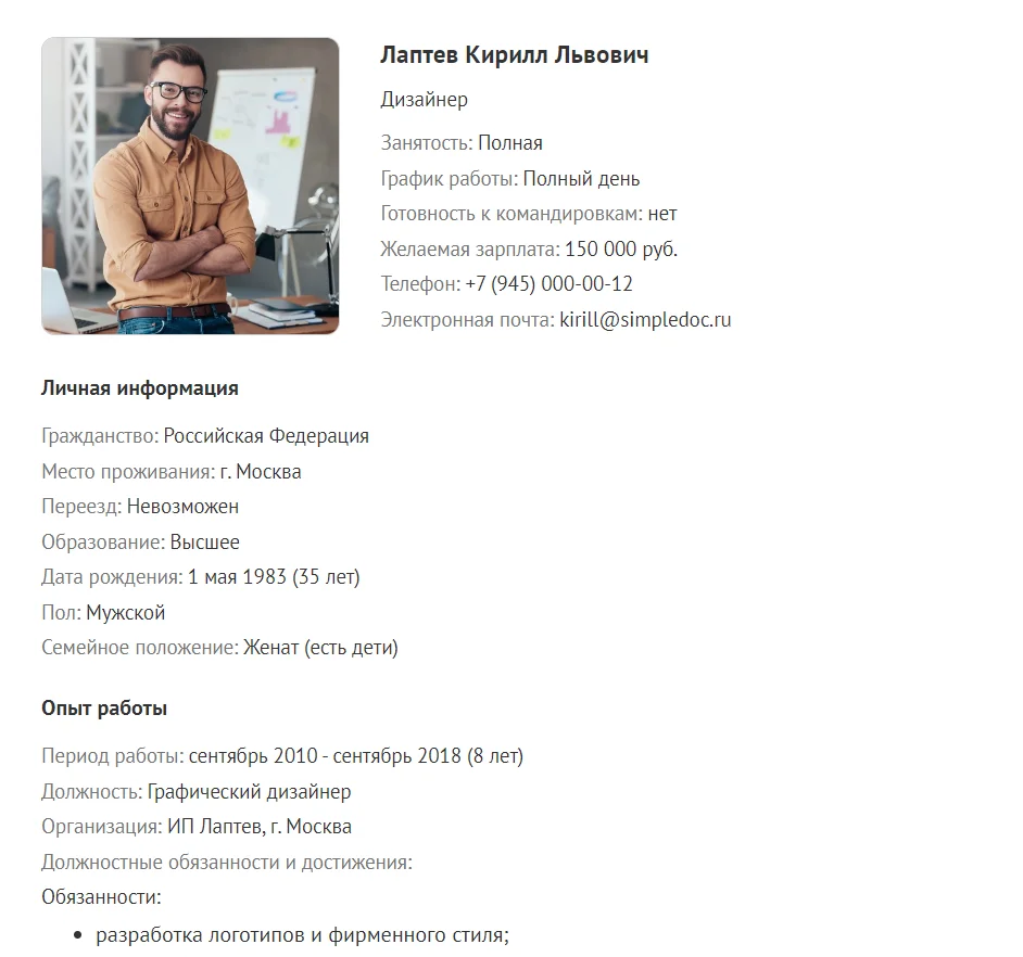 Создание резюме выглядит так: заполняете формы и получаете готовый файл в формате DOC и PDF.