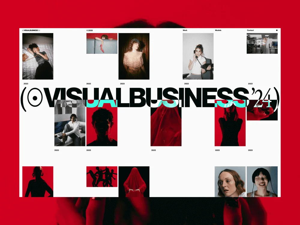 Хороший пример динамического ритма — сайт-портфолио студии фото- и видеопродакшена Visual Business. Здесь работы представлены в разном масштабе, с воздухом и лёгкой хаотичностью. При этом их объединяет крупный текстовый логотип, который наслаивается на изображения на главном экране. Здесь же заметна и модульная сетка: фотографии чётко выстроены по колонкам и строкам.
