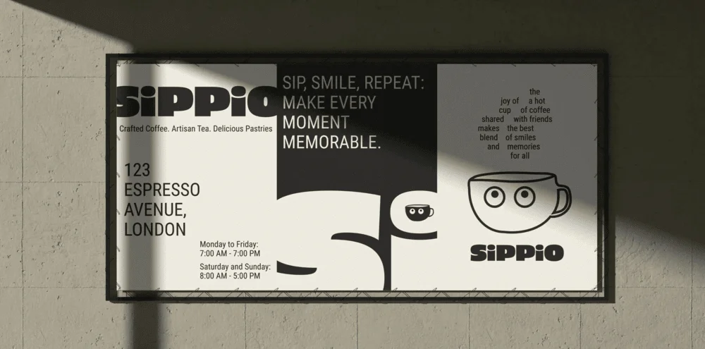 В рекламном баннере кофейни визуальная иерархия выстроена за счёт отступов, начертания и размера шрифтов, а также — цветового контраста. Сначала взгляд падает на жирный шрифт названия бренда, затем — на контрастную белую надпись на чёрном фоне, затем — на крупный шрифт с адресом кофейни, а после — на дополнительные мелкие надписи.