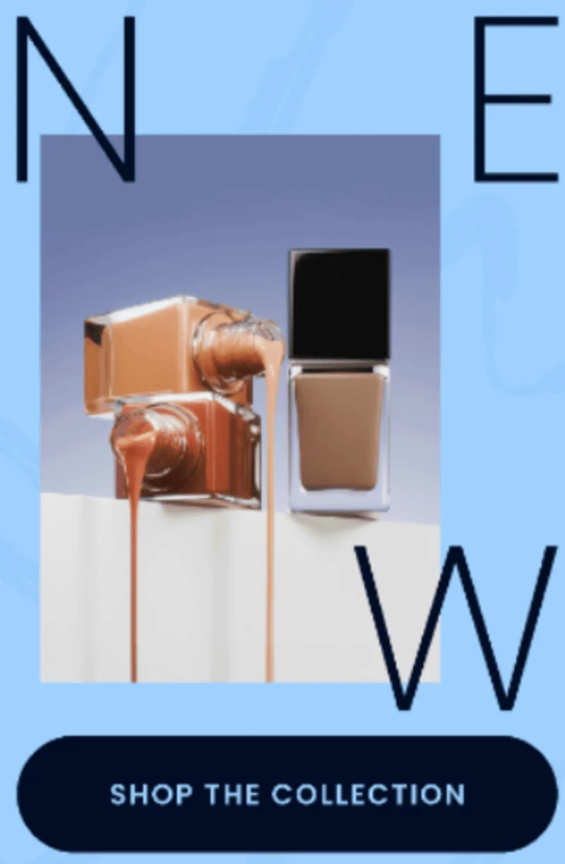 Например — в рекламном баннере новой линейки косметики необычно расположена надпись «new». Она асимметрично выстроена вокруг фокусной точки — фотографии с флаконом. Она смещена чуть влево, и это компенсирует отсутствие буквы слева внизу.