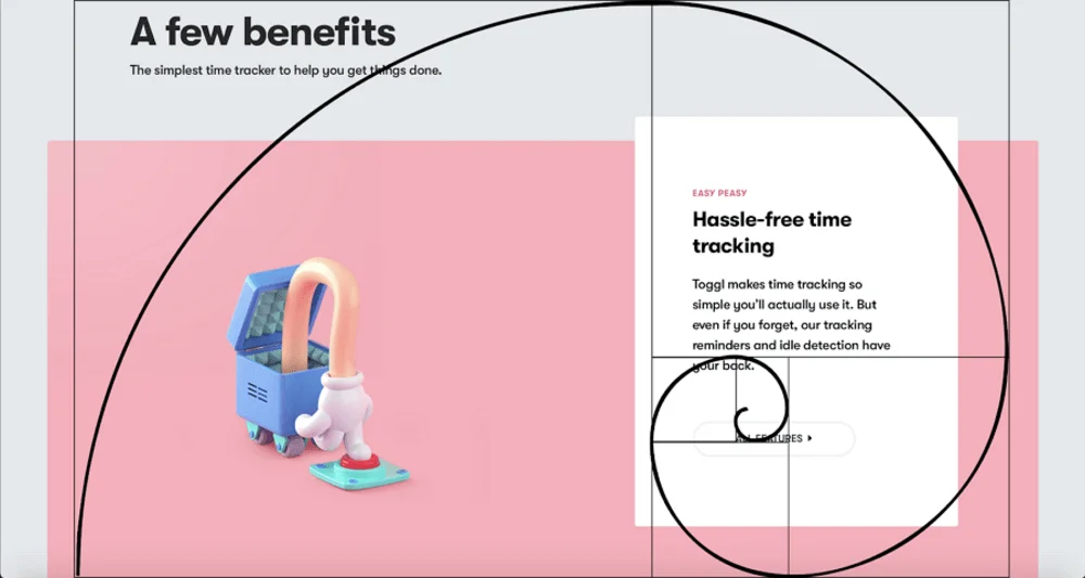 Чтобы показать пропорции золотого сечения, на макет наносят форму, напоминающую улитку: её изгибы делят пространство на прямоугольники. В примере ниже — интерфейс сайта, где в самом большом прямоугольнике расположены иллюстрация и заголовок. В квадрате поменьше — смысловой блок, а на пересечении «хвоста» улитки находится CTA-кнопка.
