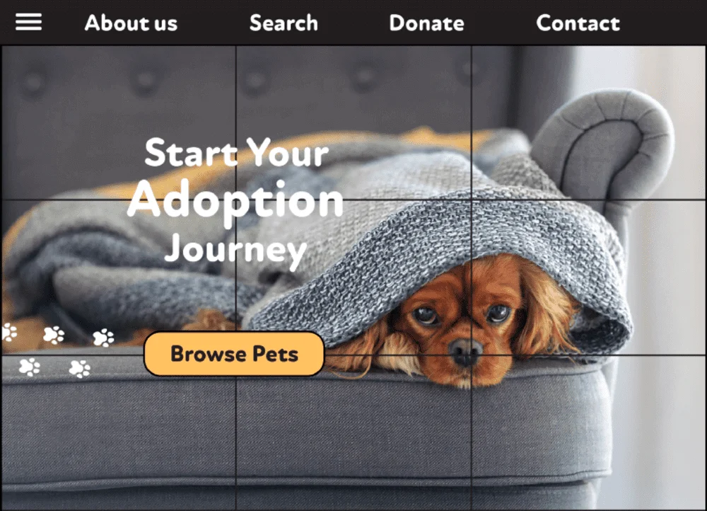 Хороший пример — главный баннер сайта приюта домашних животных. Мордочка собаки, призыв к действию и кнопка размещены на пересечении линий, а основная смысловая часть изображения занимает центральную «строчку» баннера.