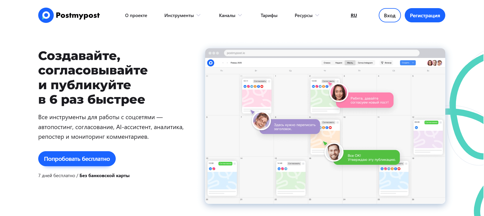 Postmypost — сервис для системного управления соцсетями, который используют как отдельные SMM-специалисты, так и команды и агентства. Платформа подходит для выстраивания процессов целиком: от планирования контента до публикаций, контроля и аналитики — всё собрано в одном интерфейсе.