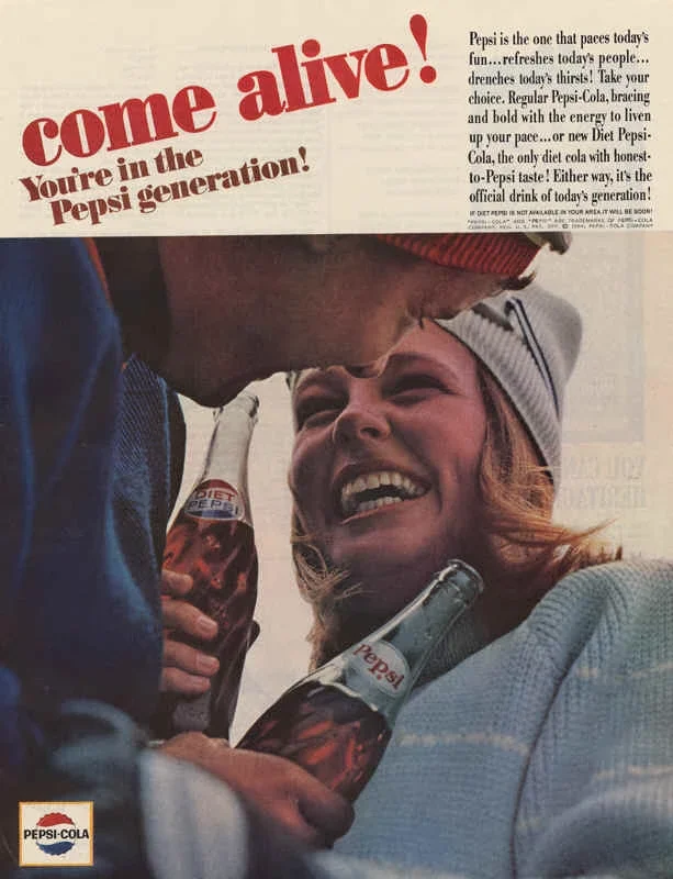 Pepsi перевела фокус на молодежь, драйв, вызов. В 1963 бренд запустил рекламную кампанию Pepsi Generation со слоганом: «Оживитесь! Вы — поколение Pepsi!». В рекламе фигурировали образы счастливых энергичных молодых людей и девушек.