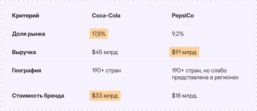 PepsiCo также присутствует на глобальном рынке, но ее бренды слабо представлены в регионах, по сравнению с Coca-Cola.