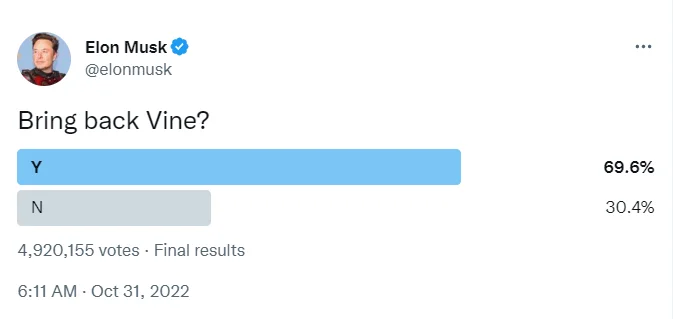 Вернуть популярность сервису Vine. Маск запустил опрос и выяснил, что 70% людей не против вернуть 6-секундные видео.