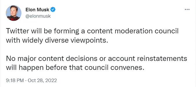 Создать совет по модерации контента. Сразу после покупки Маск сказал, что компания сформирует совет по модерации контента. В него войдут люди с разными точками зрения, чтобы у каких-то тем или взглядов не было привилегий по отношению к другим.