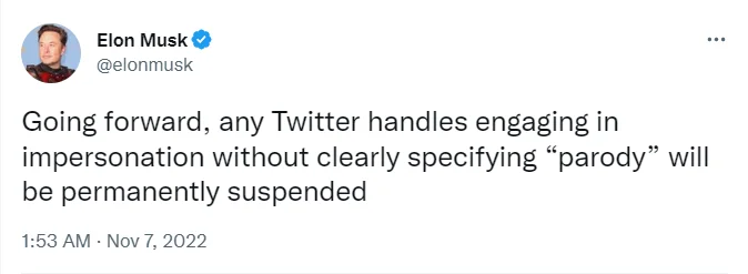 А с верификацией не задалось с самого начала: пользователи стало массово покупать галочки, чтобы притворяться другими людьми. Появились даже копии Илона Маска. Тогда новый директор сказал, что будет банить подобные аккаунты, если в них не будет сказано, что они пародийные.