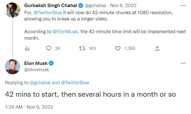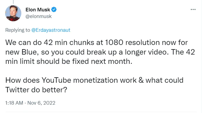 Затем Маск планирует увеличить 42-минутный лимит до нескольких часов.