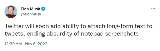 Увеличить допустимое количество символов в посте. Сейчас можно публиковать посты длиной до 280 символов, но в скором времени Маск планирует увеличить значение до 4 000 символов. Это избавит от необходимости добавлять в посты скриншоты из блокнота с длинными текстами, рассказывает директор в своем аккаунте.