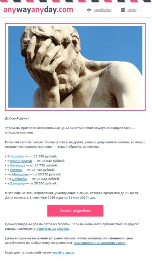 Тема письма должна быть честной и прямой, поскольку именно её клиент видит в первую очередь. Не маскируйте проблему рекламными формулировками и кликбейтом. Здесь не нужны метафоры и изысканные обороты. Клиент должен сразу понять, о чём письмо.