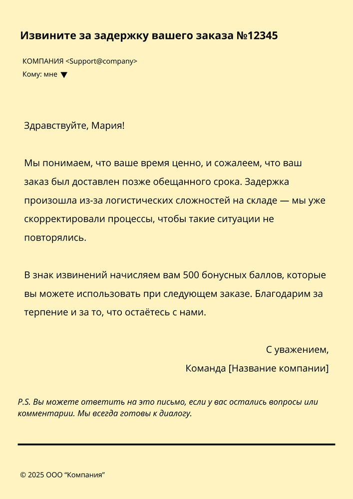 Во вступительной части сразу обозначьте проблему и возьмите ответственность. Не нужно писать длинную подводку к ситуации. Клиент уже раздражён. Ему нужны не реверансы, а понимание того, что вы осознаёте проблему.