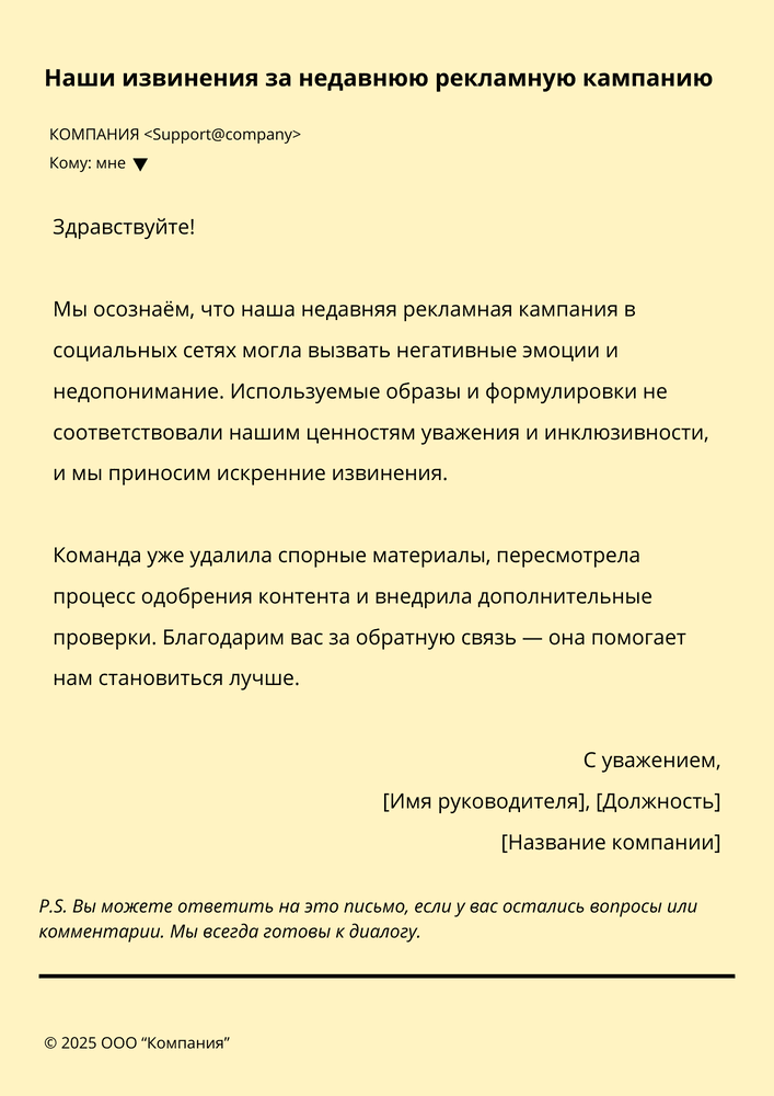 Избегайте перекладывания вины на третьих лиц. Не стоит писать «поставщик подвёл», «курьерская служба опоздала». Берите ответственность на себя — а если уверены, что вы не виноваты, то и не извиняйтесь.