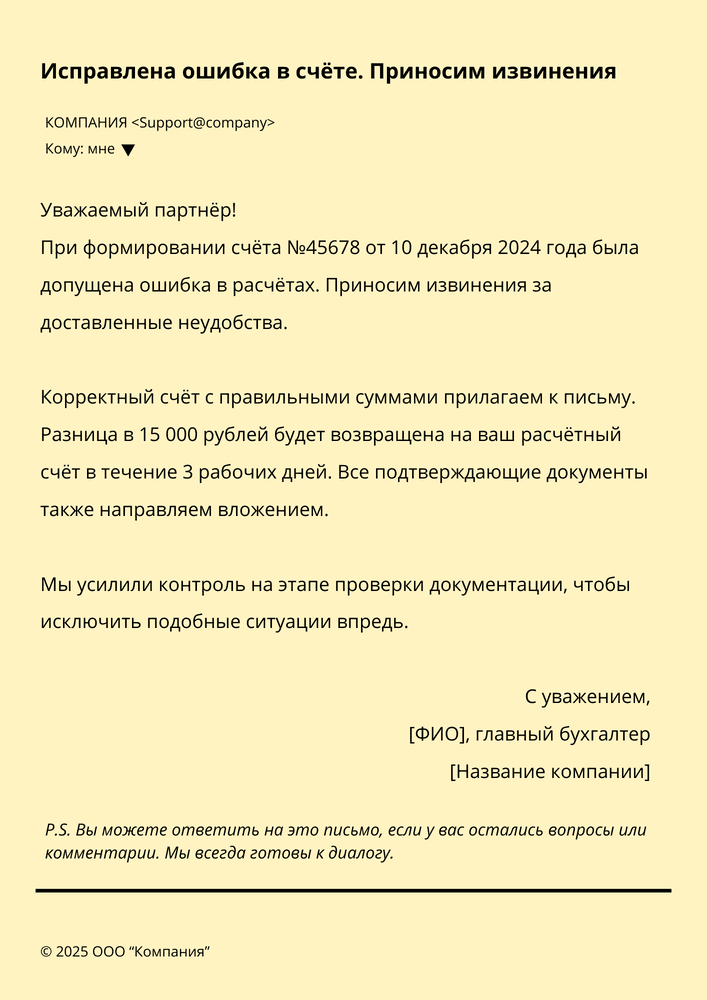 Прямое признание ошибки в первых строках снижает градус напряжения и настраивает на конструктивный диалог. Избегайте фраз вроде «к сожалению, возникли обстоятельства», ибо они звучат как уход от ответственности. Говорите прямо.