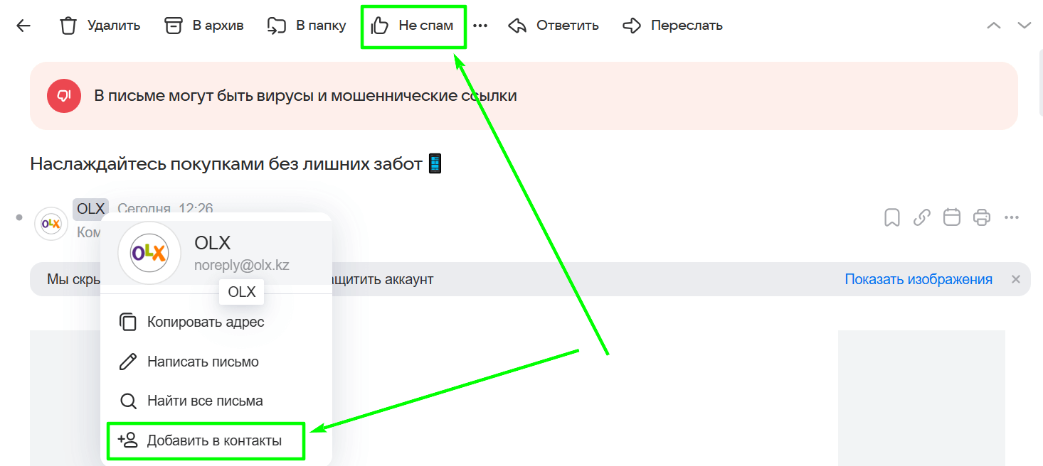 Пометьте как «Не спам». Если вы нашли письмо в спаме, обязательно пометьте его как «Не спам» или «Надёжный отправитель». Это обучит ваш почтовый сервис и предотвратит попадание будущих писем от этого отправителя в спам.